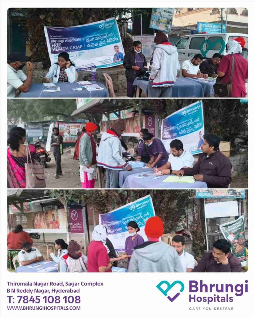 Bhrungi Hospitals successfully organized a Free Mega Health Camp at Opp Teachers Colony, Pochamma Temple Ground, Gurramguda.